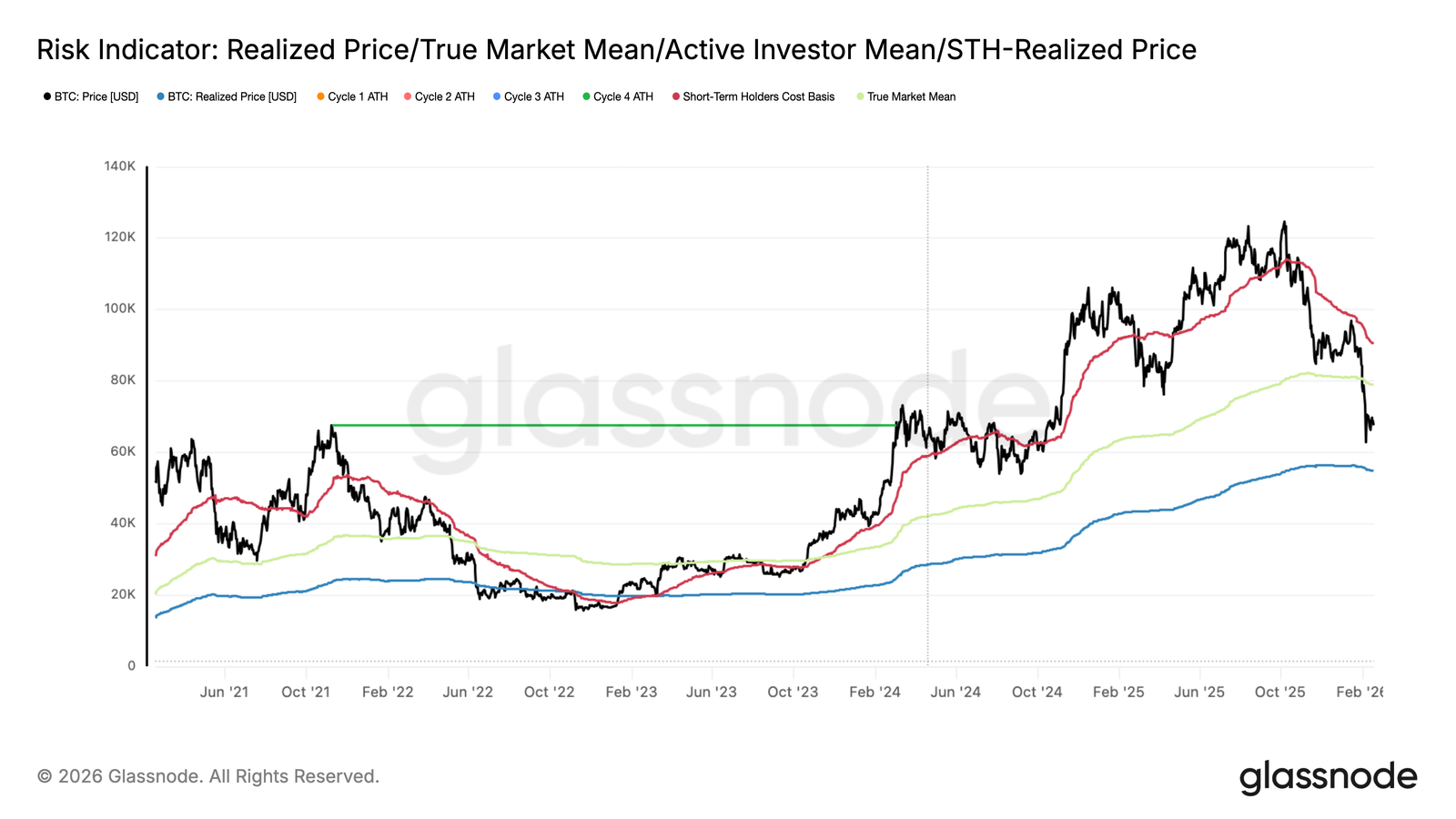 หลังราคาของ Bitcoin ร่วงหลุด True Market Mean ที่ประมาณ 79,000 ดอลลาร์ มันเป็นสัญญาณว่าเรากำลังเข้าสู่ระยะใหม่ของตลาด โดยในอดีต ราคา Bitcoin มักจะลงไปลึกกว่านี้บริเวณ Realized Price ที่ในปัจจุบันอยู่ที่ประมาณ 54,900 ดอลลาร์