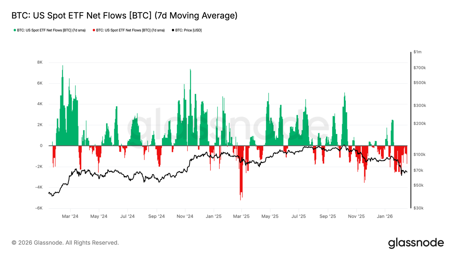 Net Flows ของ Bitcoin Spot ETFs ไหลออกอย่างต่อเนื่อง สิ่งที่เคยทำหน้าที่เป็นแรงซื้อที่สม่ำเสมอได้หายไป ส่งสัญญาณถึงการหดตัวของ Demand จากนักลงทุนระดับสถาบัน