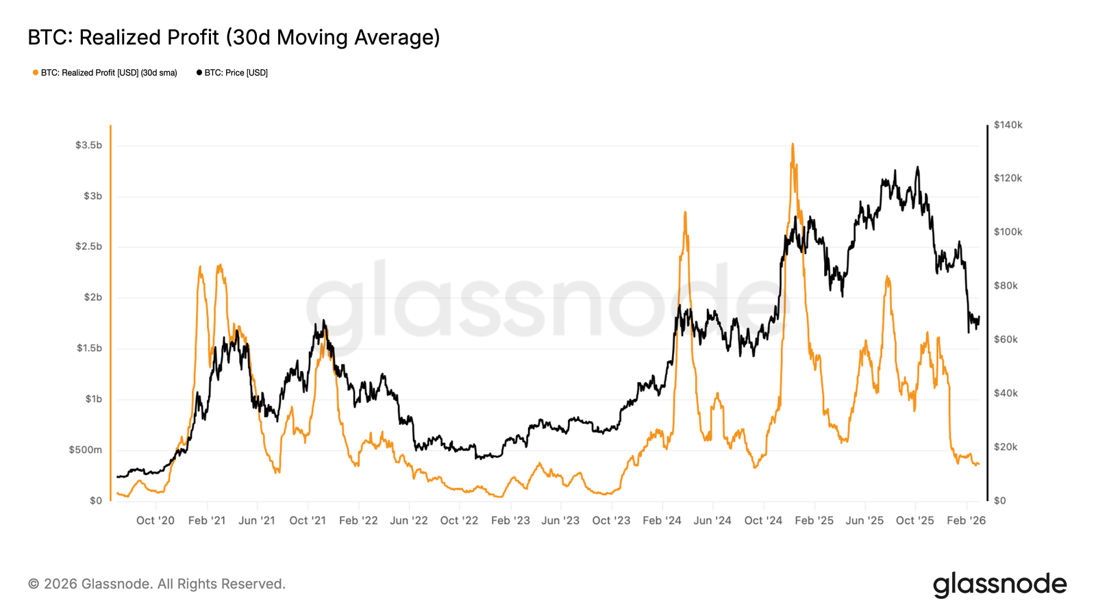 ค่าเฉลี่ย 30 วันของ Realized Profit ได้ลดลงจาก 1,000 ล้านดอลลาร์ต่อวัน เหลือประมาณ 370 ล้านดอลลาร์ต่อวัน หรือลดลงประมาณ 63%