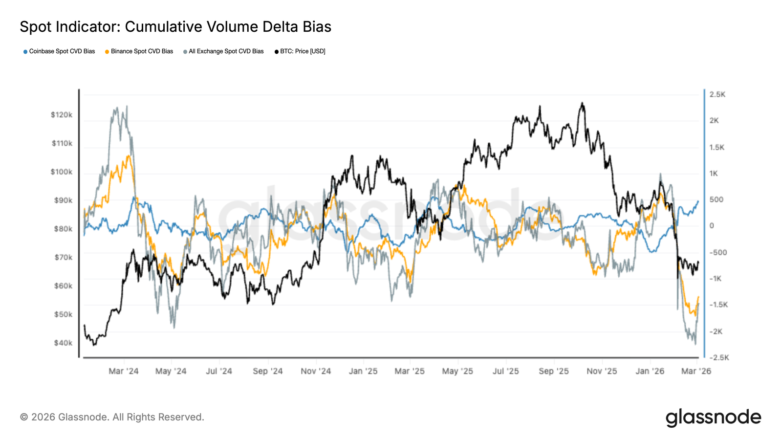 🟢 สัญญาณบวก: CVD ที่เพิ่มขึ้นบ่งบอกว่าช่วงเวลาที่มีการขายอย่างรุนแรงมากที่สุดในตลาด Spot อาจจะผ่านไปแล้ว แต่การฟื้นตัวของราคาที่ดีน่าจะต้องการแรงซื้อจากหลายแพลตฟอร์ม ไม่ใช่แค่จาก Coinbase