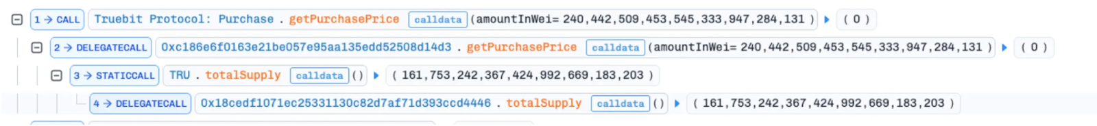 จากนั้นผู้โจมตีเรียกฟังก์ชัน Mint เพื่อสร้างโทเค็น $TRU จำนวน 240,442,509,453,545,333,947,284,131 หน่วยออกมาแบบฟรีๆ แล้วสลับไปเรียกฟังก์ชัน Burn ซ้ำหลายรอบเพื่อแลก TRU ทั้งหมดกลับเป็น ETH จาก Reserve ของโปรโตคอล