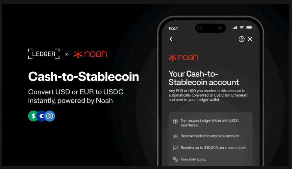 Ledger ได้รวมบริการ Noah เข้ามา เป็นบริการ Cash-To-Stablecoin ทำให้ผู้ใช้สามารถเติมเงิน Fiat (USD หรือ EUR) เข้า Wallet ได้อย่างรวดเร็วโดยไม่มีค่าธรรมเนียมเพิ่มเติม และแปลงเป็น Stablecoin USDC ได้ทันที ซึ่งช่วยให้การทำธุรกรรม On-chain ด้วย Stablecoin เป็นเรื่องง่ายขึ้น