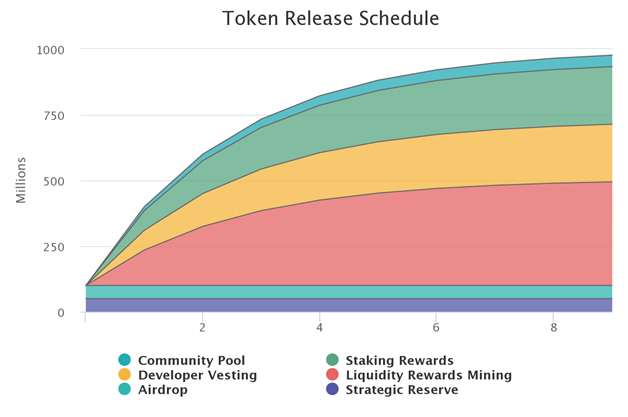 เหรียญ $Osmo มี Maximum Supply อยู่ที่ 1000 ล้าน Token โดยมี Supply เริ่มต้นที่ 100 ล้าน Token ที่แบ่ง 50% แจกเป็น Airdrop ให้กับผู้ที่ Stake เหรียญ Atom และอีก 50% แบ่งเข้า Strategic Reserve ซึ่งในปัจจุบันมี Circulating Supply อยู่ที่ 435 ล้าน Token ซึ่ง Token ที่ถูกสร้างขึ้นมาใหม่ (Inflation) จะลดลงในอัตราส่วนหนึ่งต่อสามในทุกปี (Thirdening) โดยในปีแรกเหรียญ $Osmo จะปลดออกมา 300 ล้าน Token และหลังจากปีแรกจะลดลงหนึ่งในสามจึงปลด 200 ล้าน Token ในปีต่อมา และปีที่สามเหลือ 133 ล้านโทเคน และลดลงไปเรื่อยๆในแต่ละปี ซึ่งเหรียญที่ปลดมาใหม่จะนำไปจัดสรรเป็น Staking Reward, LP Incentive, Developer Vesting และ Community Pool โดยมีรายละเอียดตามภาพด้านบน