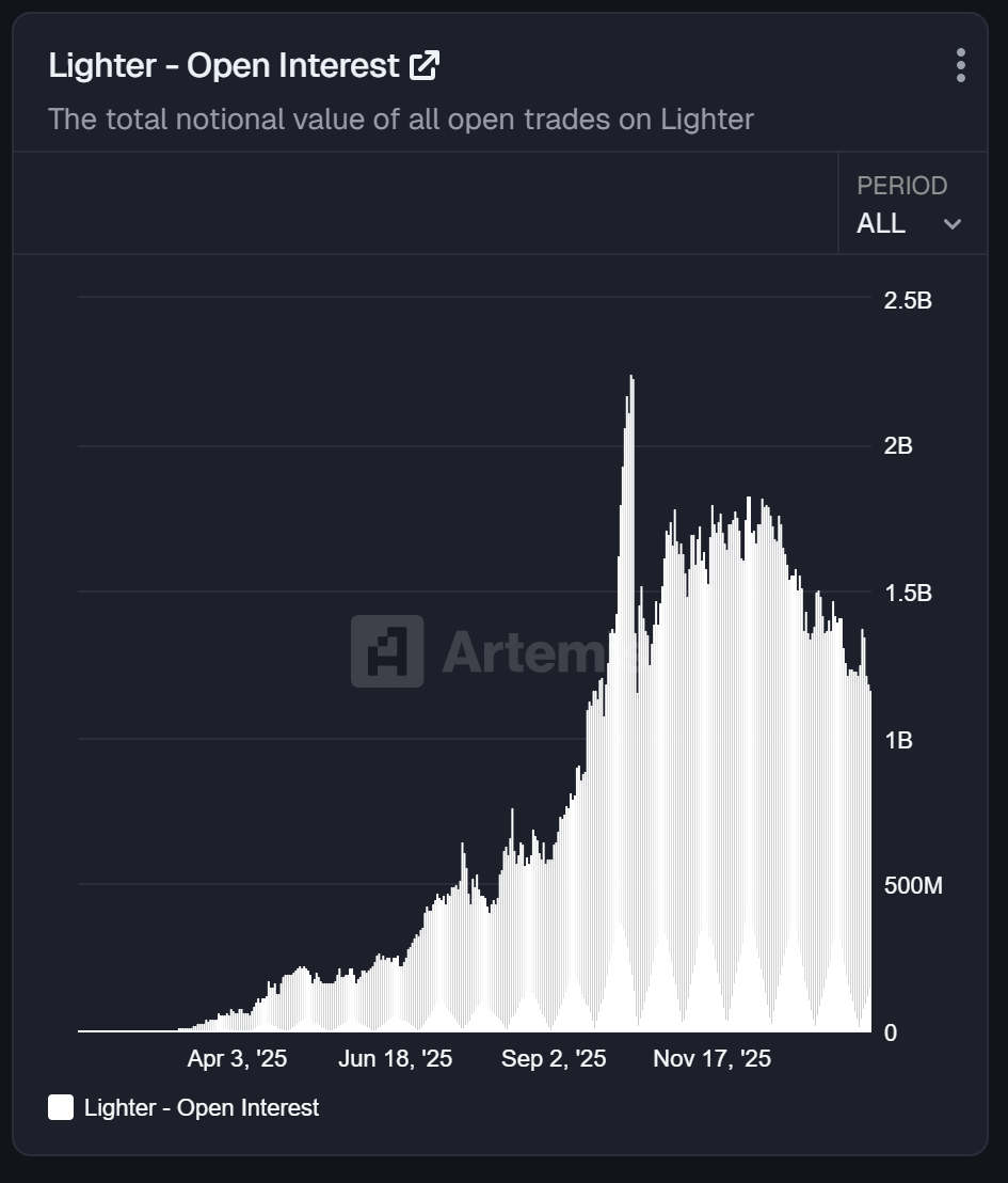 แม้ Volume การเทรดจะดูสูงมากในช่วงก่อนการแจกเหรียญ แต่ถ้าดูจาก Open Interest (OI) ณ ต้นเดือนกุมภาพันธ์ 2026 จะเห็นว่า Lighter มีค่า OI เฉลี่ยอยู่ที่ประมาณ 1,300 ล้านดอลลาร์เท่านั้น เมื่อนำไปเทียบกับ Hyperliquid จะพบว่าห่างกันกว่า 5 เท่า