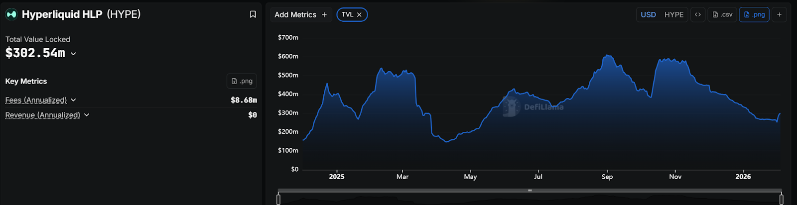 The chart also shows that HLP's TVL throughout 2025 fluctuated according to market conditions, such as during May and Sept-Oct 2025, or during March 2025 when there was an attack on HLP through the price manipulation of the JELLYJELLY token. Despite this volatility, the total balance typically recovered quickly.