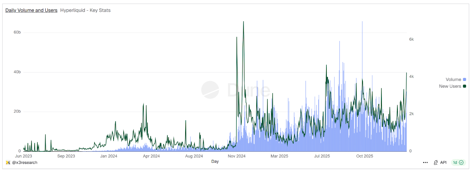 อย่างไรก็ตาม Trade Volume (สีฟ้า) ไม่ได้ร่วงตาม User แต่กลับยังรักษาระดับฐานที่สูงกว่าช่วงก่อนแจก Airdrop ได้ สิ่งนี้พิสูจน์ว่า Hyperliquid สามารถเปลี่ยนผู้ที่มาฟาร์มบางส่วนให้กลายเป็น Sticky Users หรือผู้ใช้งานจริงได้