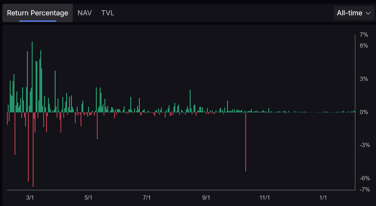 In early 2025, LLP was able to generate strong returns, particularly during the high volatility of March (as evidenced by the sharp positive and negative return bars). During that period, there were several days where returns reached as high as 5% – 8% per day.