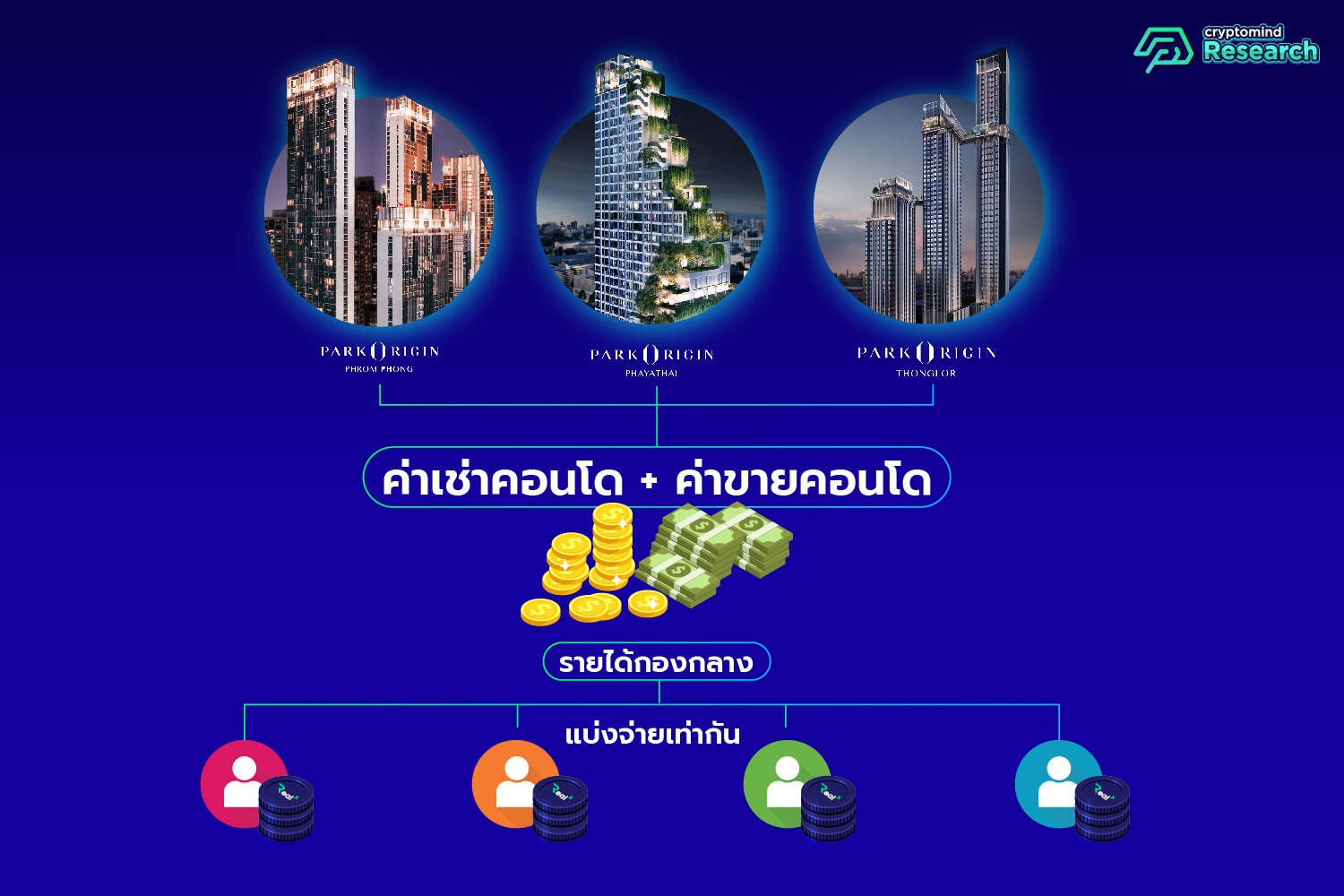ยกตัวอย่าง ค่าเช่าห้อง A ของ Park Origin พญาไท ได้เดือนละ 22,000 บาท และค่าเช่นห้อง B ของ Park Origin ทองหล่อ ได้ 29,000 บาท รายได้ของผู้ถือเหรียญ RealX จะเอาค่าเช่าทั้งหมดที่ได้มารวมกันเหมือนเป็นกองกลาง (Pool) แล้วหารด้วยจำนวน RealX Token ทั้งหมดเพื่อแจกจ่ายให้ทุกคนเท่ากัน