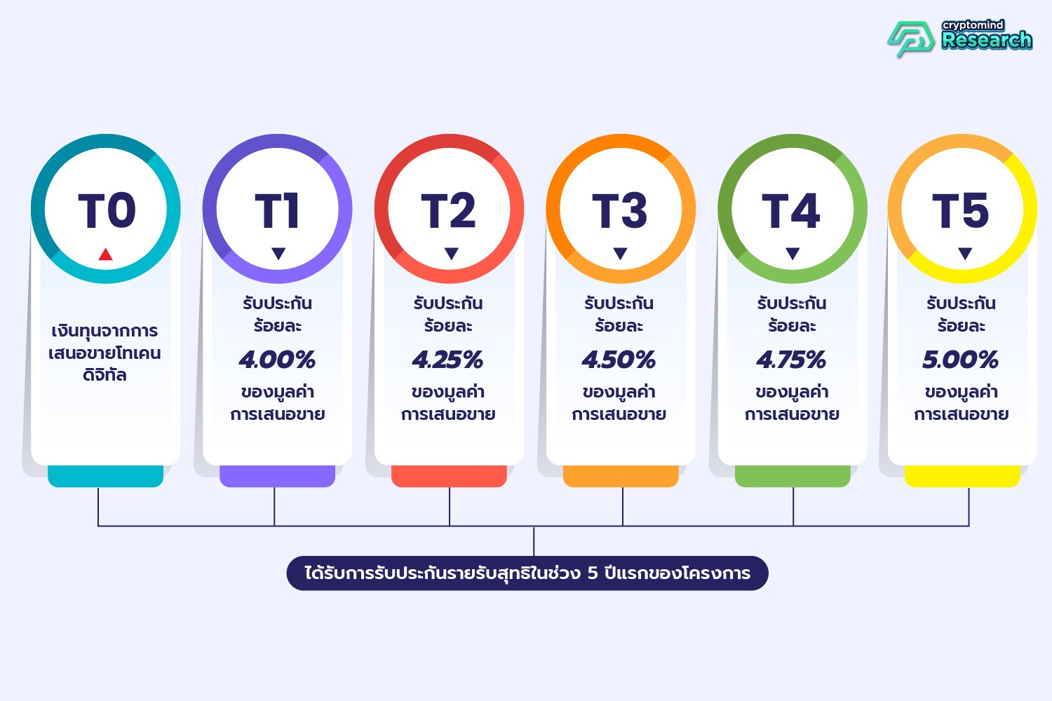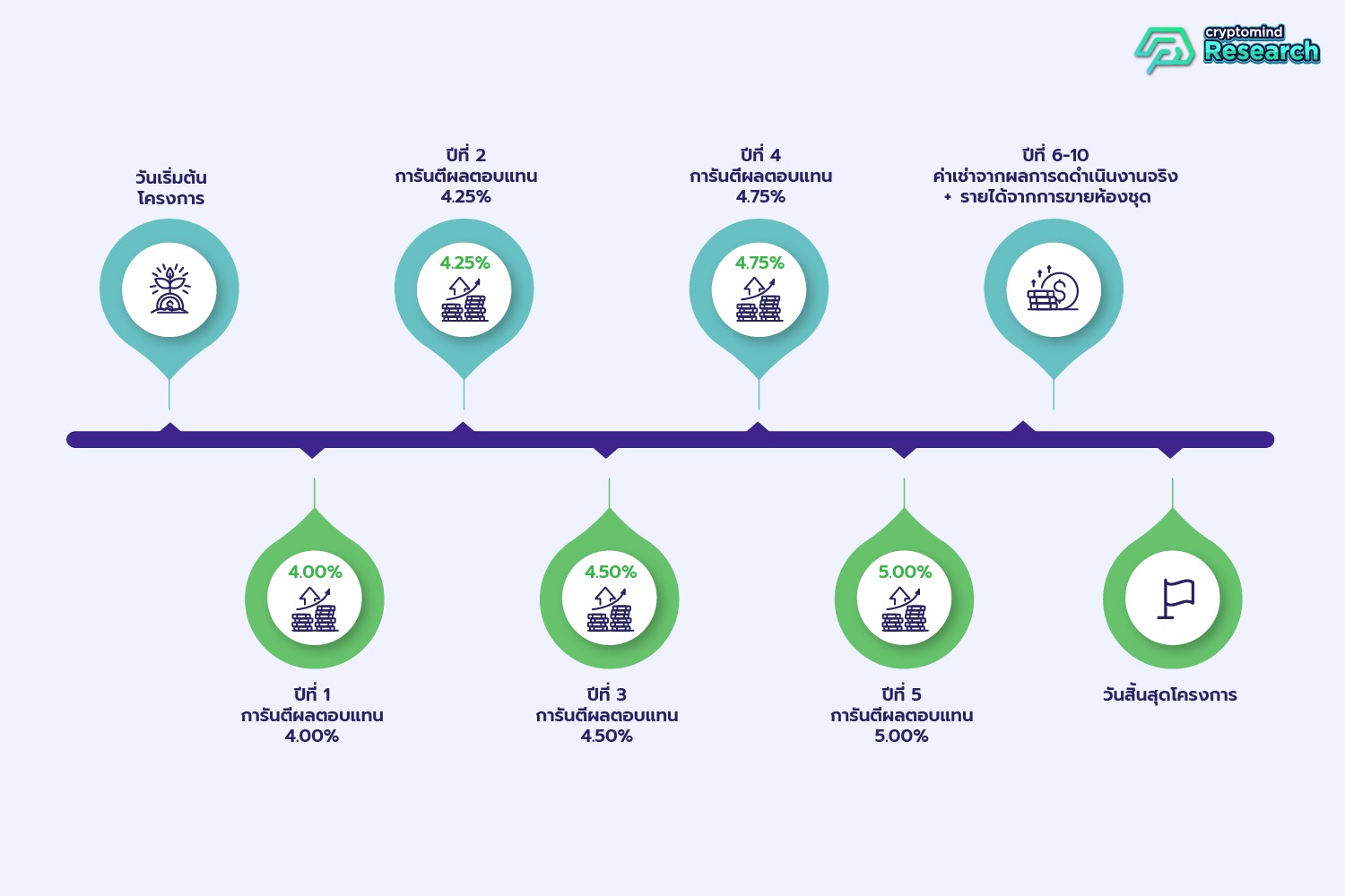 อีกหนึ่งจุดเด่นที่ทำให้ RealX Token มีความน่าสนใจคือ “ค่าเช่า ในช่วง 5 ปีแรก” จะได้รับประกันรายรับสุทธิของโครงการที่ 4% 4.25% 4.50% 4.75% และ 5% ต่อปีของมูลค่า RealX ที่เสนอขายในตอนระดุมทุน จากบริษัท พาร์ค ลักชัวรี่ จำกัด ทำให้การถือครบ 5 ปี ก็จะมีกำไรคืนมา 22.5% ของเงินต้นแล้ว ส่วนปีที่ 6 เป็นต้นไปจะขึ้นอยู่กับผลประกอบการจริงจากรายได้ค่าเช่าหักค่าใช้จ่ายที่เกี่ยวข้อง